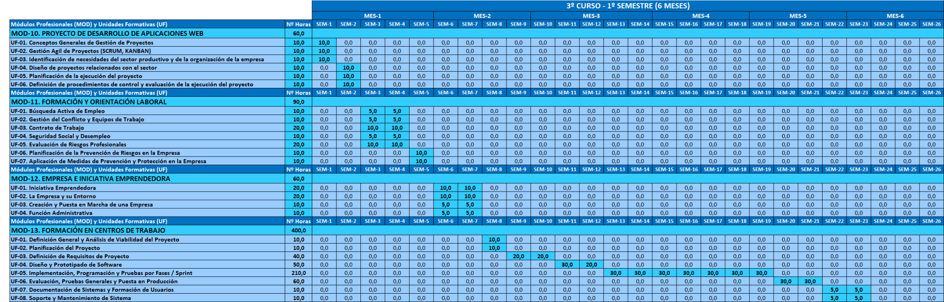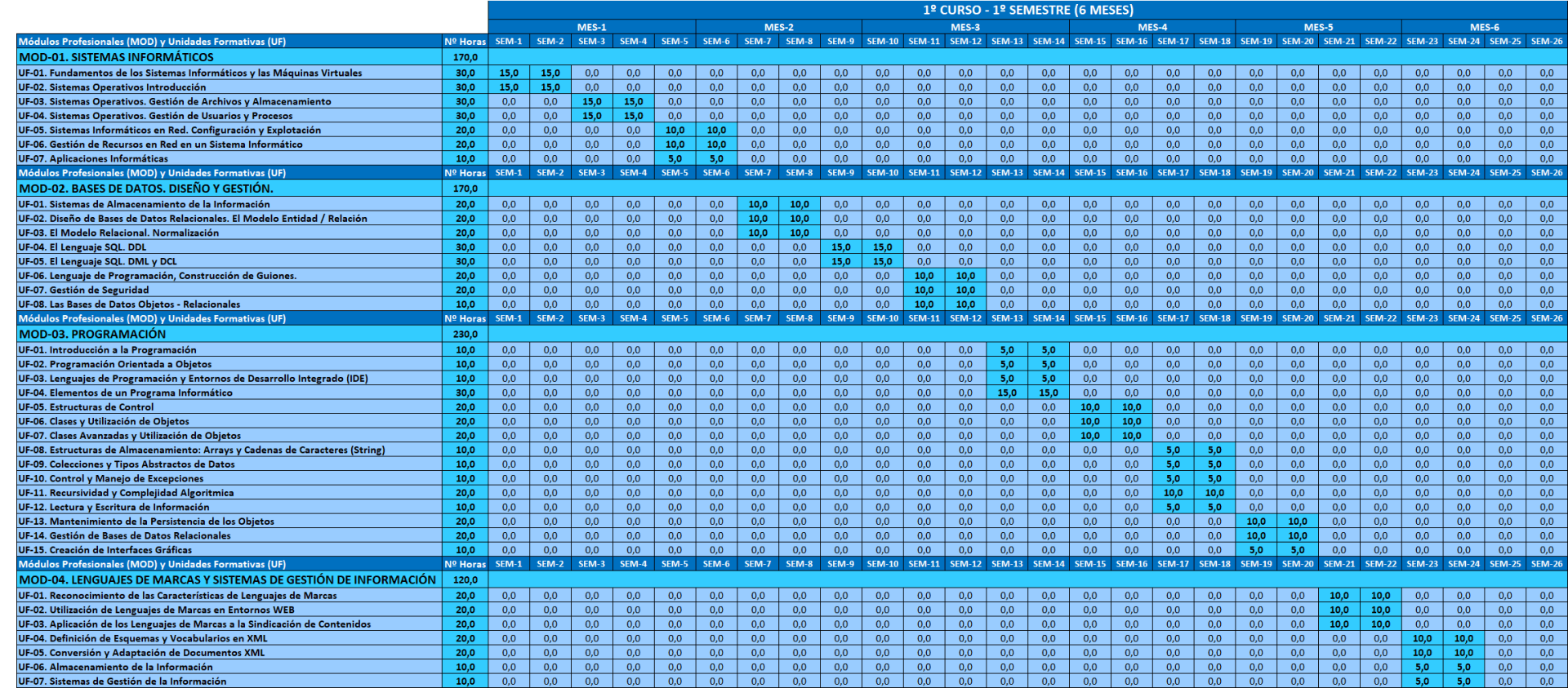 - 1ª Año del Ciclo Formativo (1º Semestre = 26 semanas):